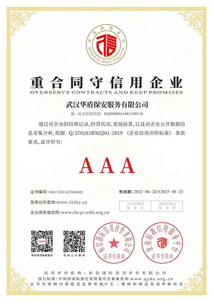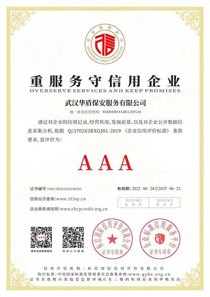武汉华盾保安服务有限公司在湖北省工商行政管理局登记注册,由湖北省公安厅批准并颁发《保安服务许可证》的专业保安服务公司。公司为客户提供驻场服务、大型场地盛事服务、随身护卫服务、安全检查服务、技术防范服务等;客户类型涵盖了国家部委、政企事业单位、金融机构、医疗卫生部门、高等院校、工业园区、大型商场、高档住宅、商务楼等,业务遍布湖北省及赣、豫、皖、湘、浙、川等周边省份。